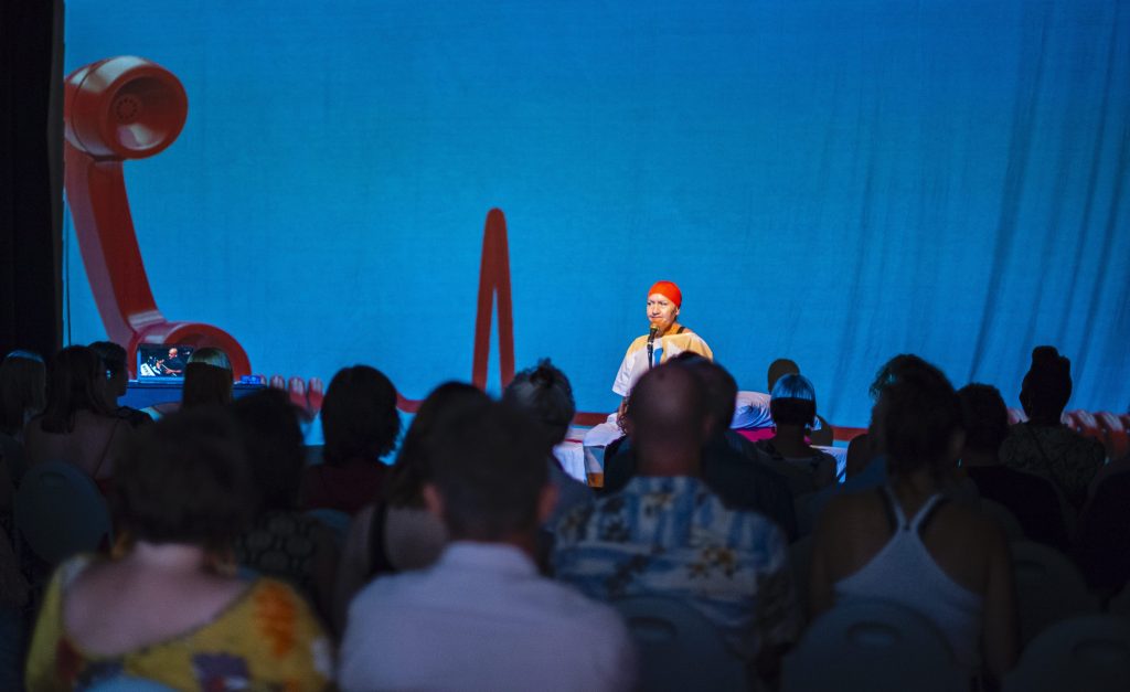 Calls to 1194 is a 50-minute, immersive and audio/visual experience where Sandra Thibodeaux performs her text within a live soundtrack played and improvised by Panos Couros on a subharmonicon.
